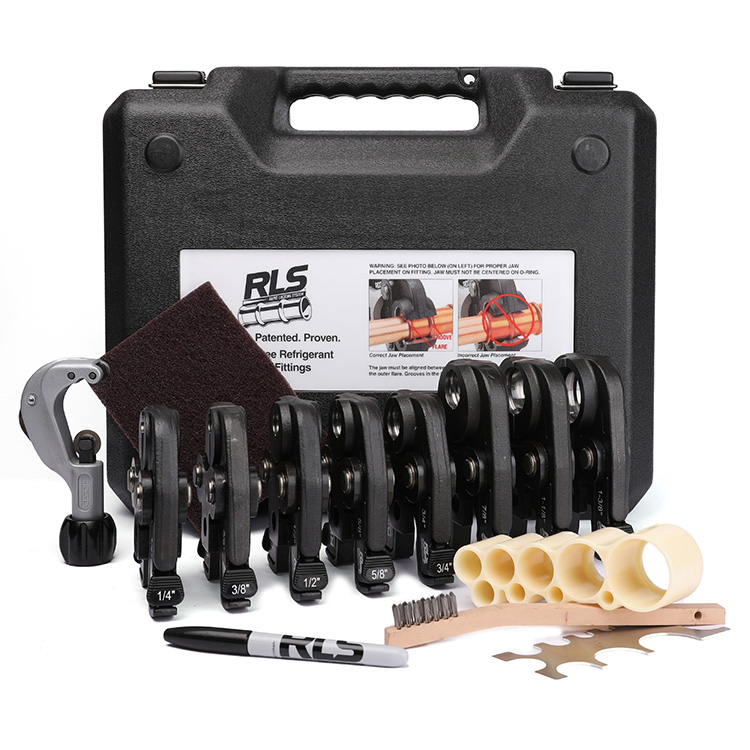 Each kit includes a full set of jaws, along with essential install accessories: a tube cutter, deburring tool, RLS depth gauge, RLS press gauge, wire brush, abrasive pad, and permanent marker—all packed in a rugged hard case built for the jobsite.
